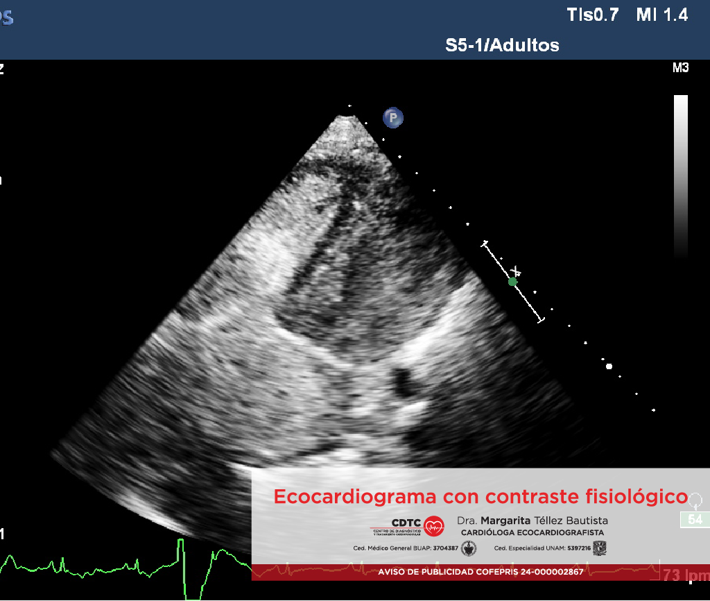Consiste en canalizar una vena periférica y administrar solución salina con una mínima cantidad de aire para conseguir la formación de microburbujas. En este caso, las microburbujas administradas se quedan en la parte derecha del corazón.