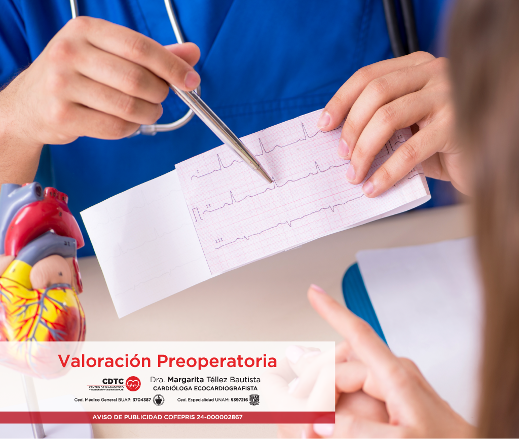 Consiste en la valoración cardiológica, que incluye electrocardiograma y ecoscopia para detectar riesgo cardiovascular previo a la realización de una cirugía de riesgo moderado por la localización del procedimiento, por la edad del paciente y las enfermedades que padezca, de esta manera le damos información y recomendaciones al anestesiólogo, para disminuir el riesgo quirúrgico.